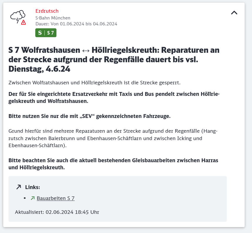 S 7 Wolfratshausen ↔ Höllriegelskreuth: Reparaturen an der Strecke aufgrund der Regenfälle dauert bis vsl. Dienstag, 4.6.24